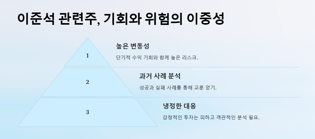 이준석 관련주는 정치 테마주의 전형적인 특징을 지니며, 단기적 수익 기회와 높은 리스크가 공존합니다.