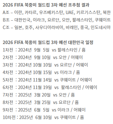 최종예선 첫 경기는 9월 7일 홈에서 팔레스타인을 상대합니다. 상대적으로 약체로 평가되는 팔레스타인이지만, 방심은 금물! 첫 단추를 잘 꿰어야 남은 경기들도 순조롭게 풀어갈 수 있습니다. 이어 9월 12일에는 오만 원정길에 오릅니다. 중동의 뜨거운 날씨와 낯선 환경 속에서 선수들의 체력과 정신력이 시험대에 오를 것입니다.