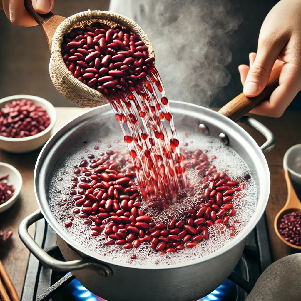 팥을 냄비에 넣고 물을 부어 한 번 끓인 후 첫 물은 버립니다. 이 과정은 팥의 떫은맛과 잡내를 제거하는 데 중요합니다. - 본격 삶기