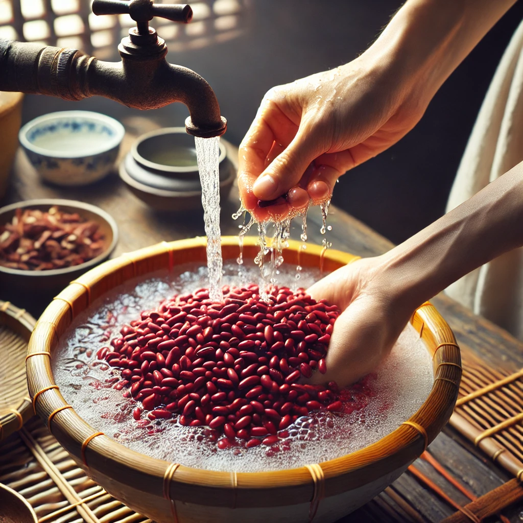팥을 깨끗이 씻은 후 물에 6시간 이상 불리세요. 불리지 않고 바로 사용하면 삶는 시간이 길어지고 식감이 덜 부드러울 수 있습니다. - 첫 물 버리기