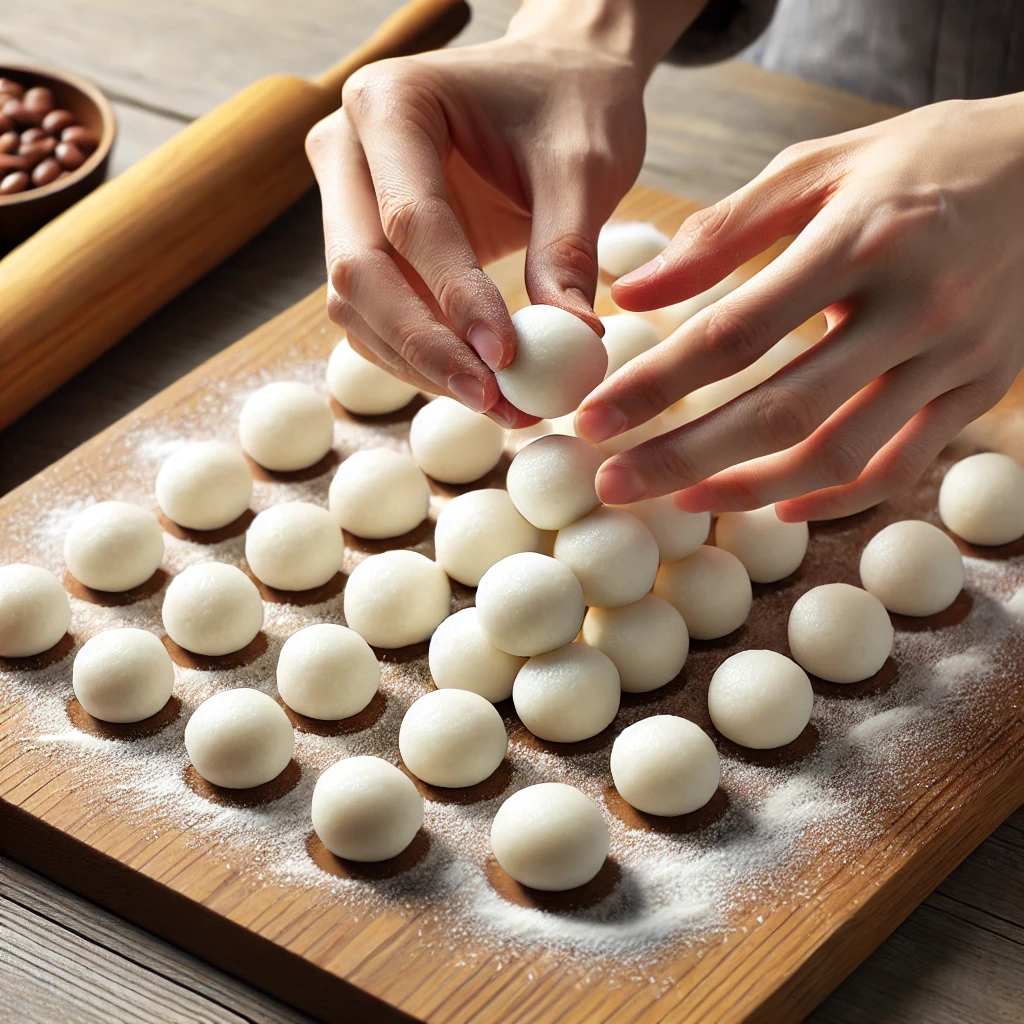 반죽을 한입 크기로 동그랗게 빚습니다. 이때 크기를 고르게 만들어야 익는 시간이 일정합니다. - 추가 팁