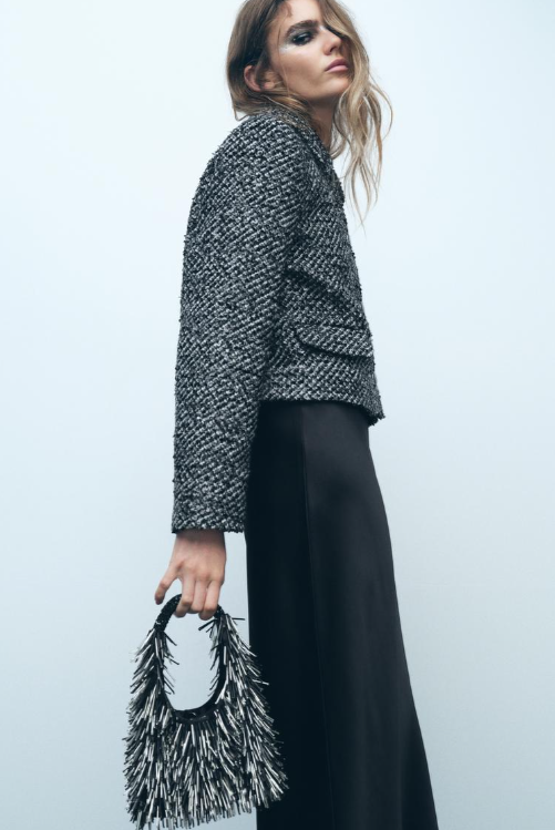 - 스타일링 팁 :: 재킷 안에 슬림한 이너를 입어 깔끔한 라인을 유지하고, 여기에 심플한 힐이나 앵클부츠를 매치하면 고급스러운 분위기를 한층 살릴 수 있습니다. 액세서리로는 사진처럼 독특한 텍스처의 클러치를 선택하면 전체적인 룩에 포인트를 줄 수 있어요. 날씨가 추운 날엔 롱코트나 퍼 머플러를 더해 보온성과 스타일을 동시에 챙길 수 있습니다.