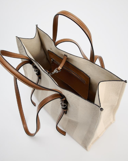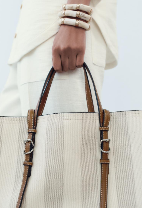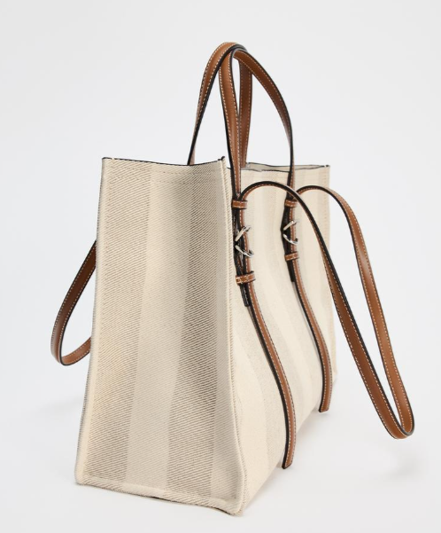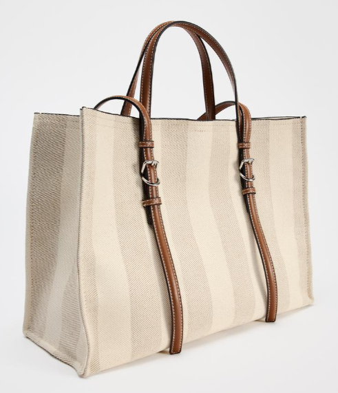 - 추천 이유: 심플하면서도 세련된 스트라이프 패턴과 브라운 가죽 디테일이 돋보이는 아이템으로, 데일리룩과 오피스룩 모두에 잘 어울립니다. 캔버스 소재와 구조적인 디자인 덕분에 캐주얼하면서도 정돈된 인상을 주며, 넉넉한 수납공간은 실용성을 높여주어 활용도가 뛰어납니다.