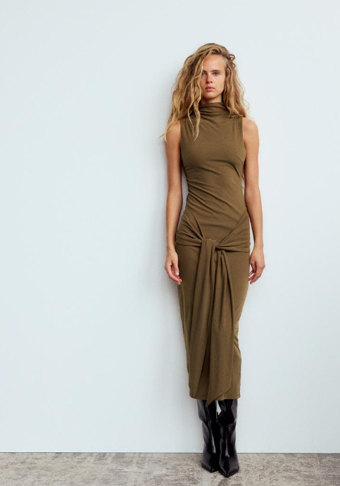 - 추천 이유: 깔끔한 하이넥 디자인과 허리 리본 디테일로 우아하면서도 세련된 무드를 연출할 수 있는 아이템입니다. 카키 브라운 컬러는 차분하면서도 고급스러움을 더해 다양한 스타일링에 활용하기 좋습니다. 특히, 허리 라인을 강조하는 리본 디테일은 실루엣을 정돈해 주면서도 페미닌 한 매력을 한층 더 부각해 줍니다.