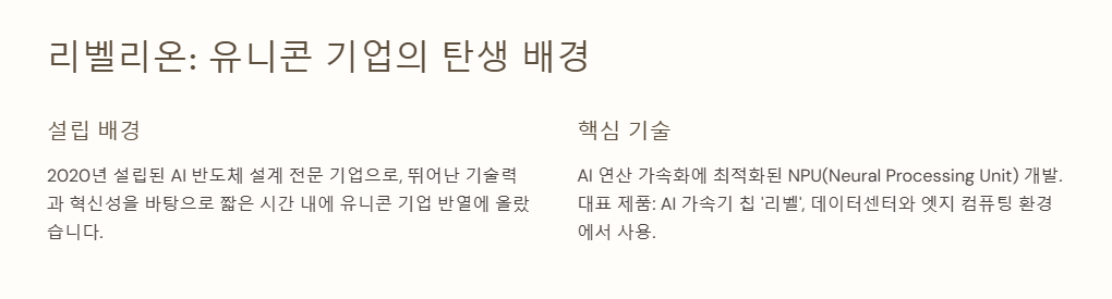 리벨리온은 2020년 설립된 AI 반도체 설계 전문 기업으로, 뛰어난 기술력과 혁신성을 바탕으로 짧은 시간 내에 유니콘 기업 반열에 올랐습니다.