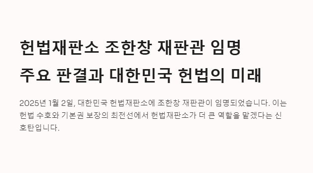 2025년 1월 2일, 대한민국 헌법재판소에 중요한 변화가 찾아왔습니다. 조한창 헌법재판관의 임명은 헌법 수호와 기본권 보장의 최전선에서 헌법재판소가 더 큰 역할을 맡겠다는 신호탄입니다. 법조계에서 풍부한 경력과 실력을 인정받아 온 조한창 재판관이 헌법재판소에 합류하며, 앞으로의 판결 방향과 국민의 기본권 보호가 어떻게 진화할지 큰 관심을 받고 있습니다.