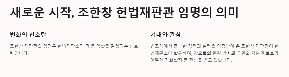 헌법재판소는 공정성과 투명성을 통해 국민의 신뢰를 얻어야 합니다. 조한창 재판관의 임명은 이러한 목표를 이루는 데 중요한 역할을 할 것입니다.