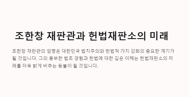 조한창 재판관의 임명은 대한민국 법치주의와 헌법적 가치 강화의 중요한 계기가 될 것입니다. 그의 풍부한 법조 경험과 헌법에 대한 깊은 이해는 헌법재판소의 미래를 더욱 밝게 비추는 등불이 될 것입니다.