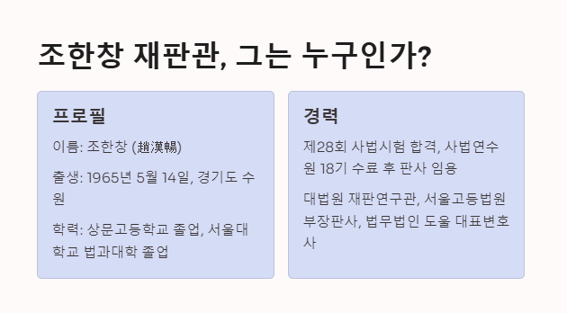 조한창 재판관은 뛰어난 법학적 소양과 실무 능력을 바탕으로 사법시험에 합격하며 법조계에 첫발을 내디뎠습니다. 이후 판사, 대법원 재판연구관, 서울고등법원 부장판사, 변호사 등 다양한 경력을 쌓으며 대한민국 법치주의 강화에 기여해 왔습니다.