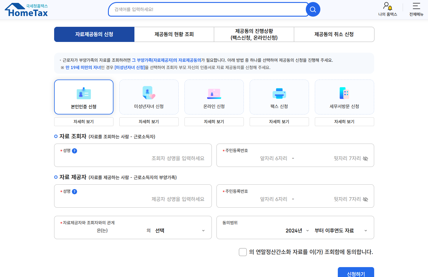 간소화 자료를 개별적으로 발급받지 않아도, 회사에 일괄 제공 동의만 하면 됩니다. - 신청 방법:
