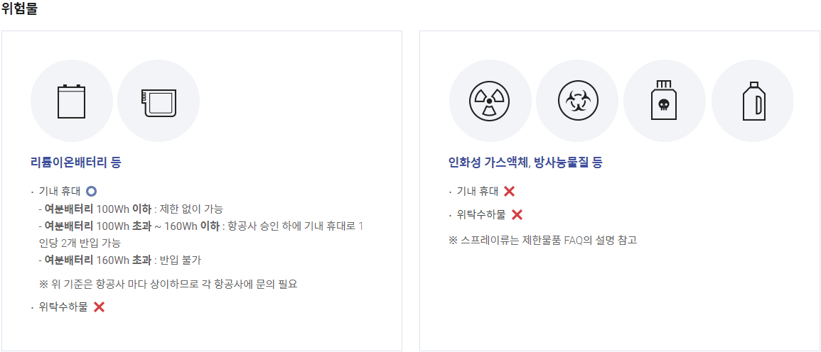 - 100Wh∼160Wh: 항공사 승인 하에 객실로 1인당 2개 반입 가능