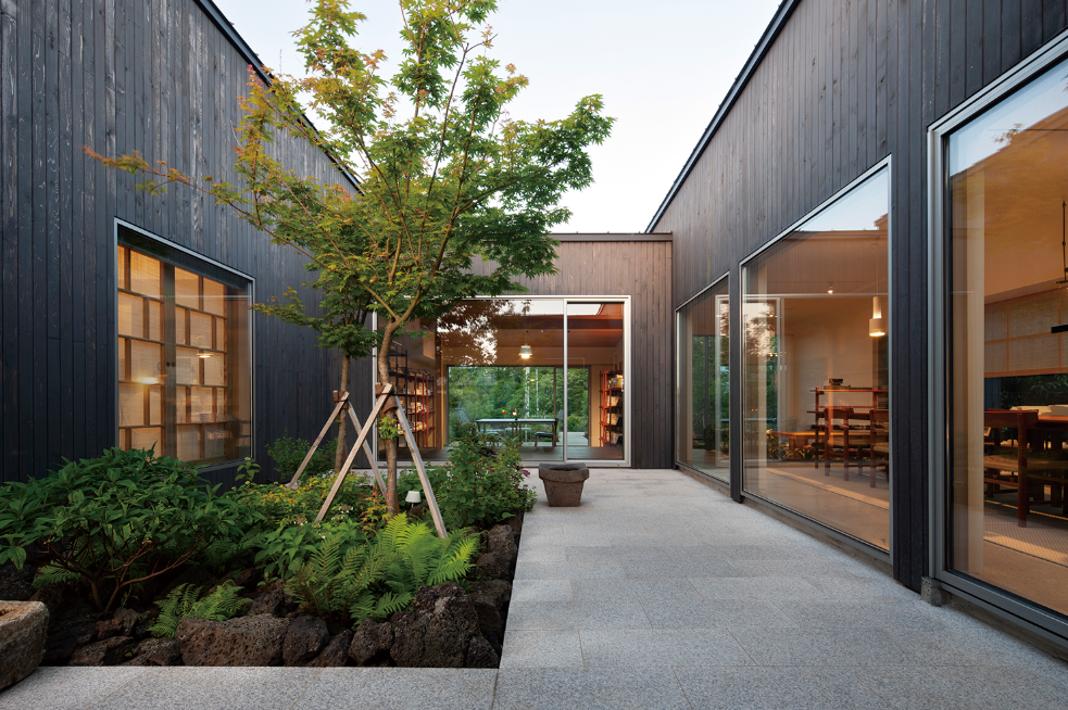 - 청수 목월재의 외관은 빛을 흡수하는 먹색으로 마감되어 자연과 동화됩니다.