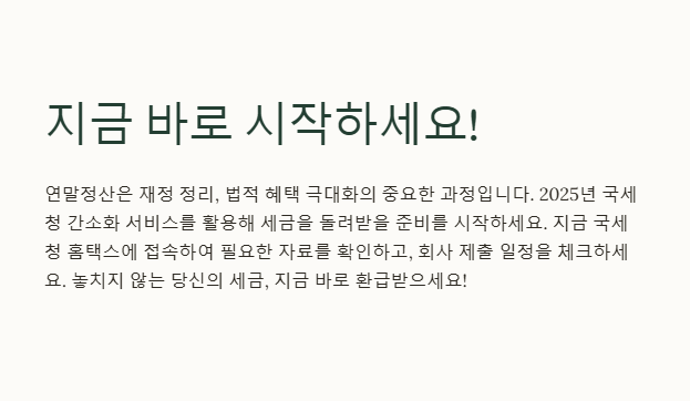 2025년 국세청 간소화 서비스를 최대한 활용해 세금을 돌려받을 준비를 시작하세요. 지금 국세청 홈택스에 접속하여 필요한 자료를 확인하고, 회사 제출 일정을 체크하세요. 놓치지 않는 당신의 세금, 지금 바로 환급받으세요!