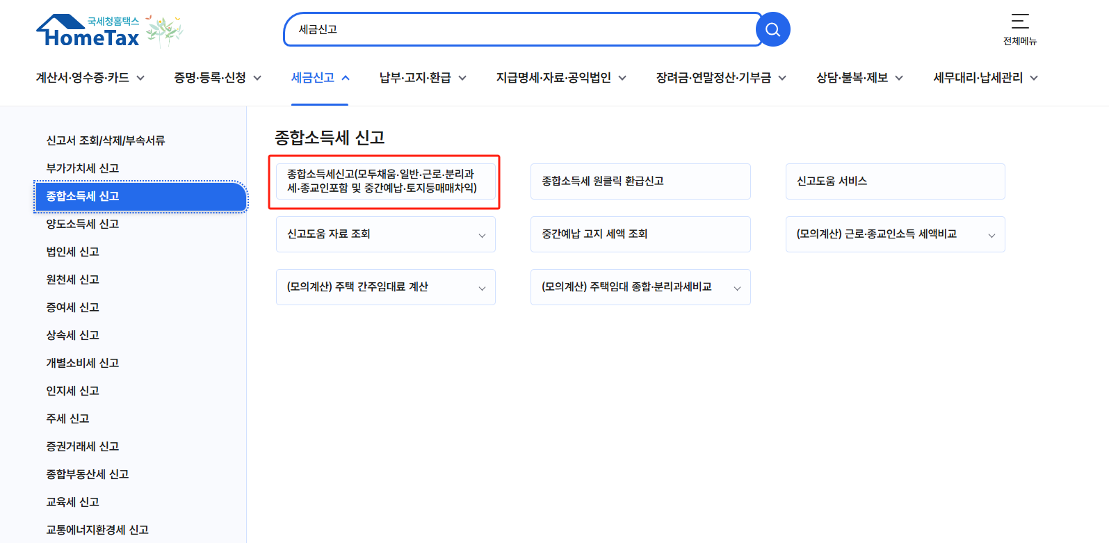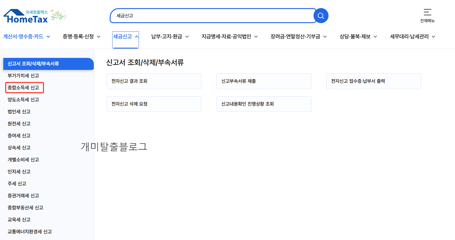 - 상단 메뉴 ‘세금신고’ → 좌측 ‘종합소득세’ 클릭