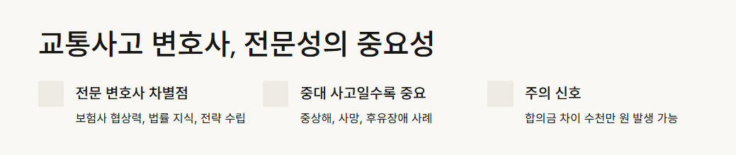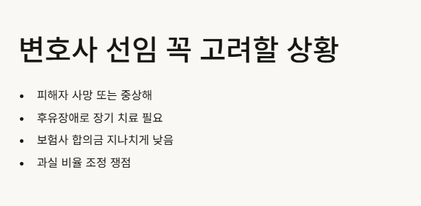 사건 처리 경험이 많은 전문 변호사는 보험사와의 협상력, 법률 지식, 사건별 전략 수립에서 일반 변호사와 차별화됩니다. 특히 중상해, 사망사고, 후유장애 같은 중대 사고일수록 그 중요성은 더 커집니다.