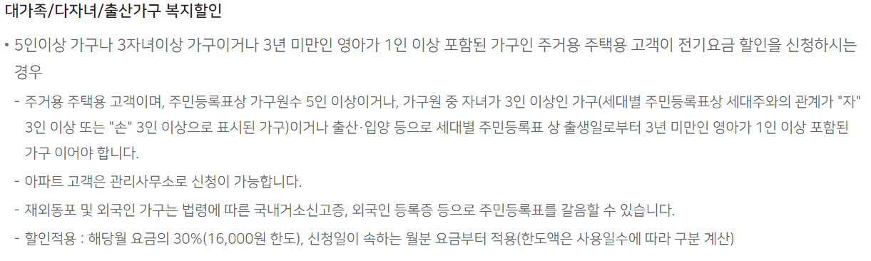 출산 가구라면 누구나 신청 가능한 전기료 감면 혜택! 매월 최대 30%까지, 16,000원 한도 내에서 할인받을 수 있습니다.