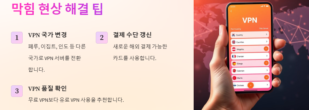 - VPN으로 기존 국가 서버에 접속하여 결제 재시도.